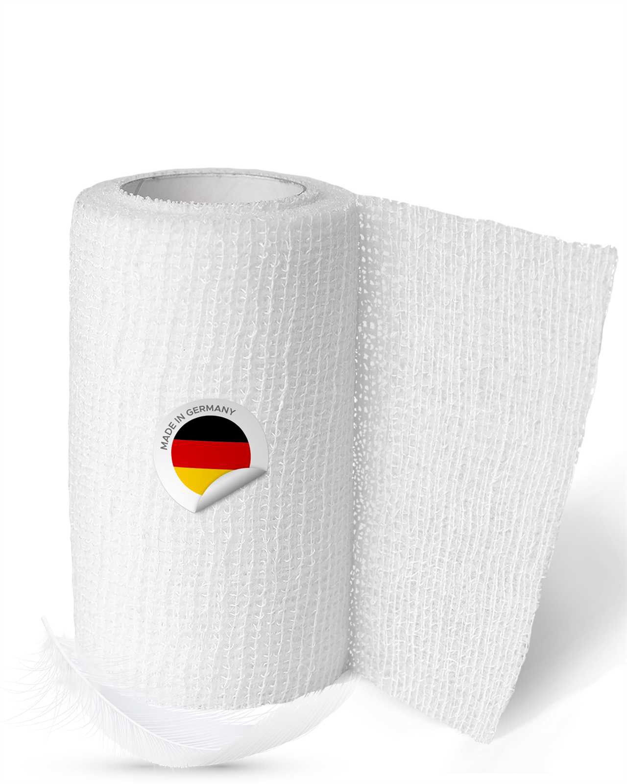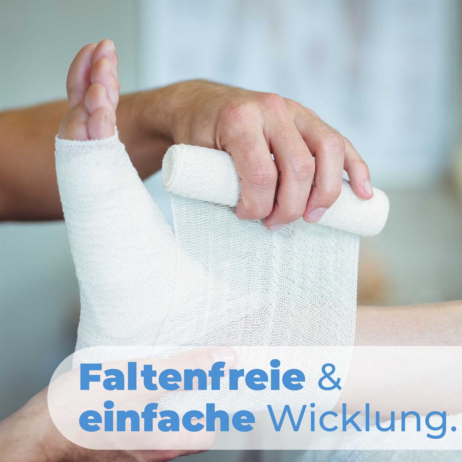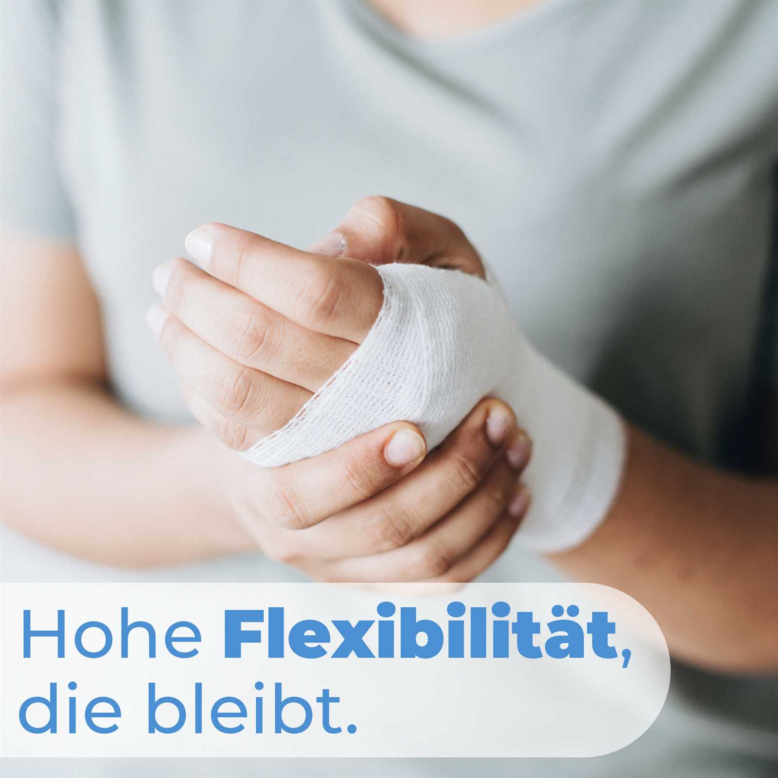 Eine hochelastische weiße Fixierbinde. Durch die Beschichtung (latexfrei) der Mullbinde 'haft' haften die einzelnen Lagen beim Verband sicher aneinander, besonders sicher und rutschfest.
