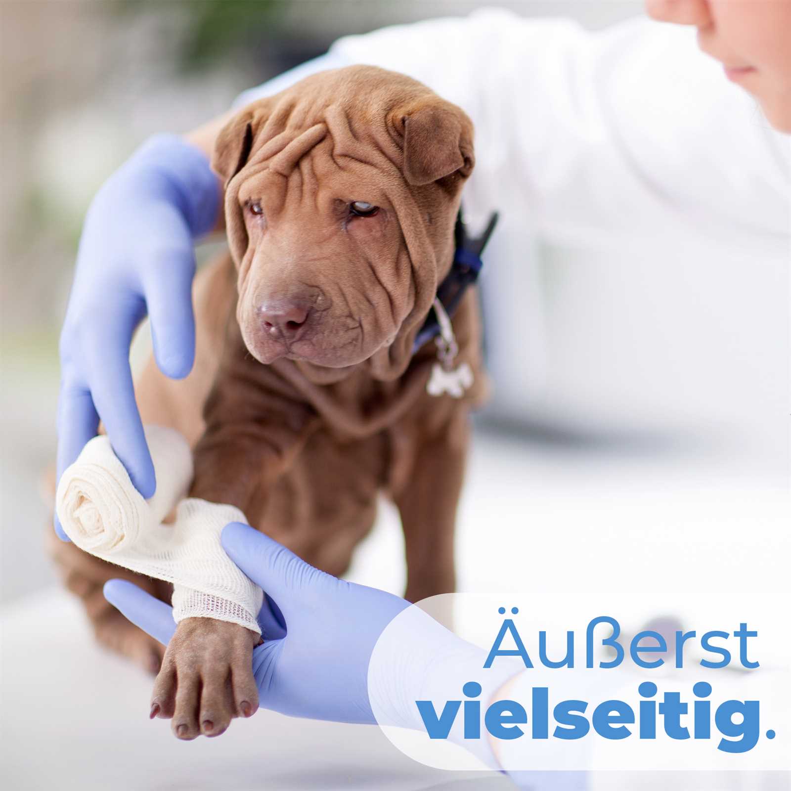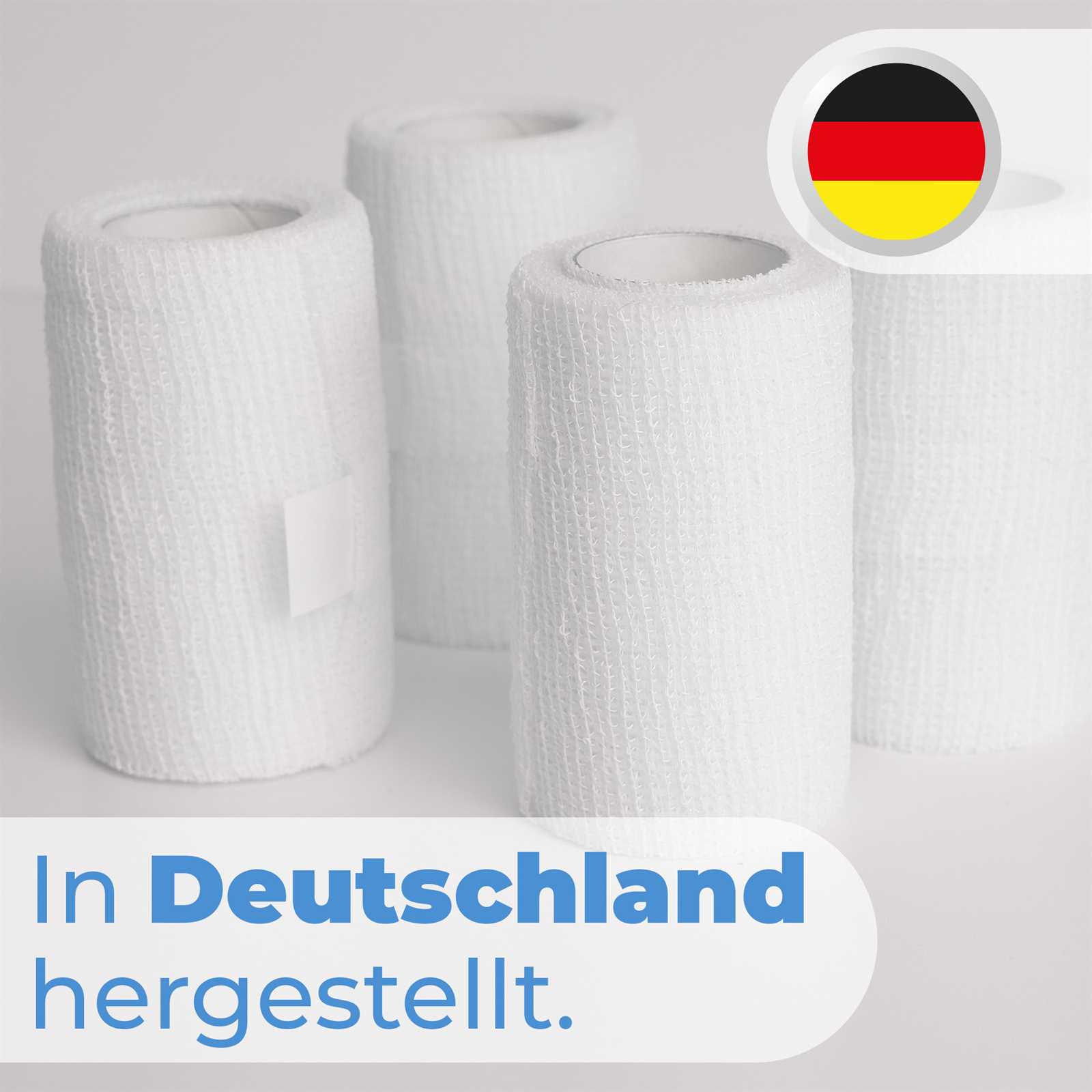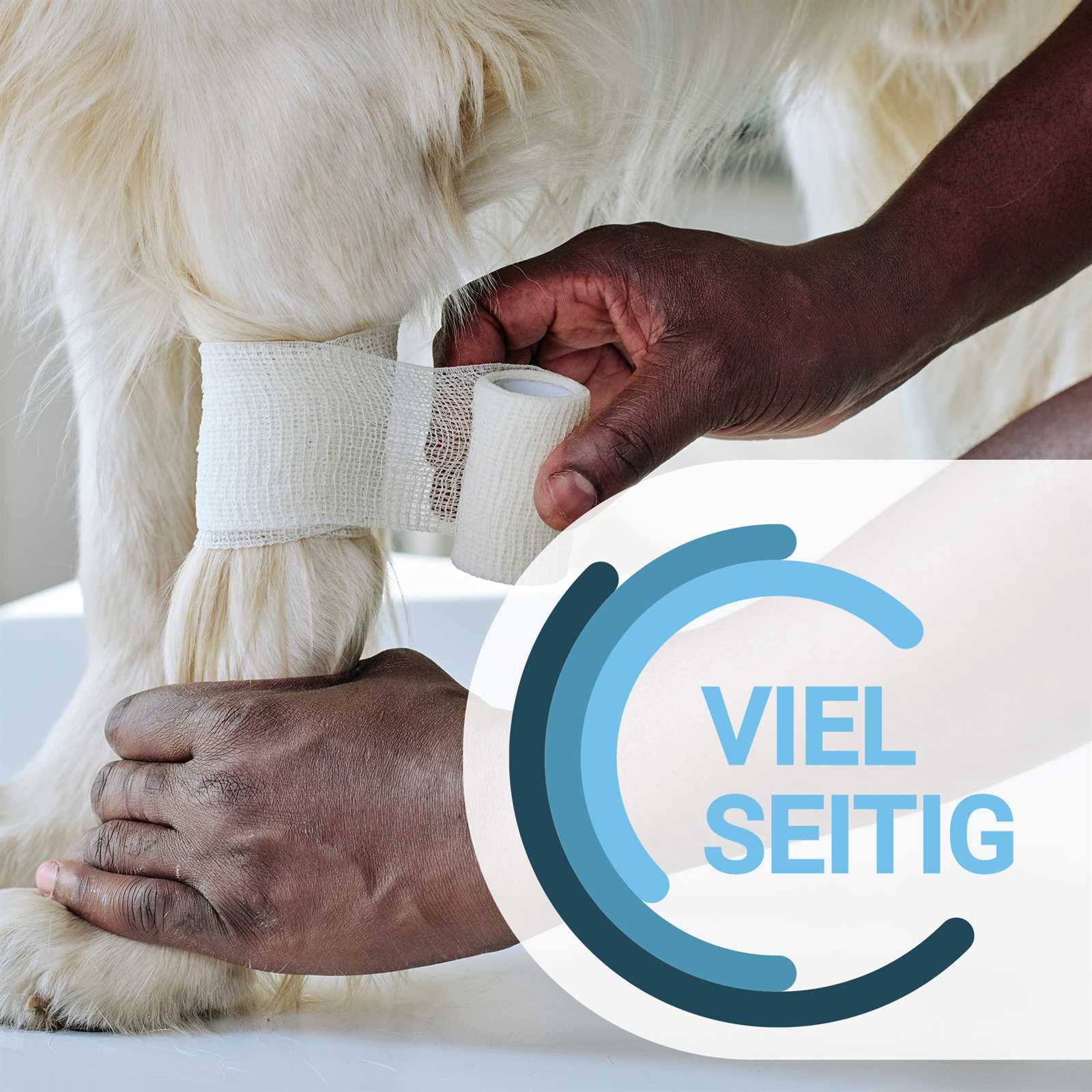 Eine hochelastische weiße Fixierbinde. Durch die Beschichtung (latexfrei) der Mullbinde 'haft' haften die einzelnen Lagen beim Verband sicher aneinander, besonders sicher und rutschfest.