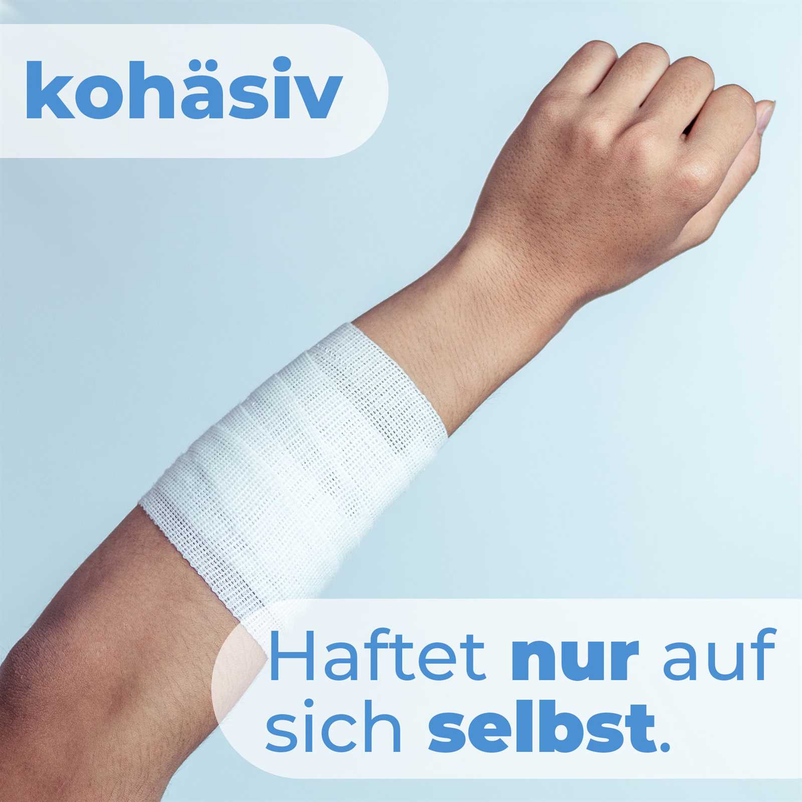 Die kohäsive Haftbinde 8cm breit ist eine Binde die auf sich selbst haftet (kohäsiv).