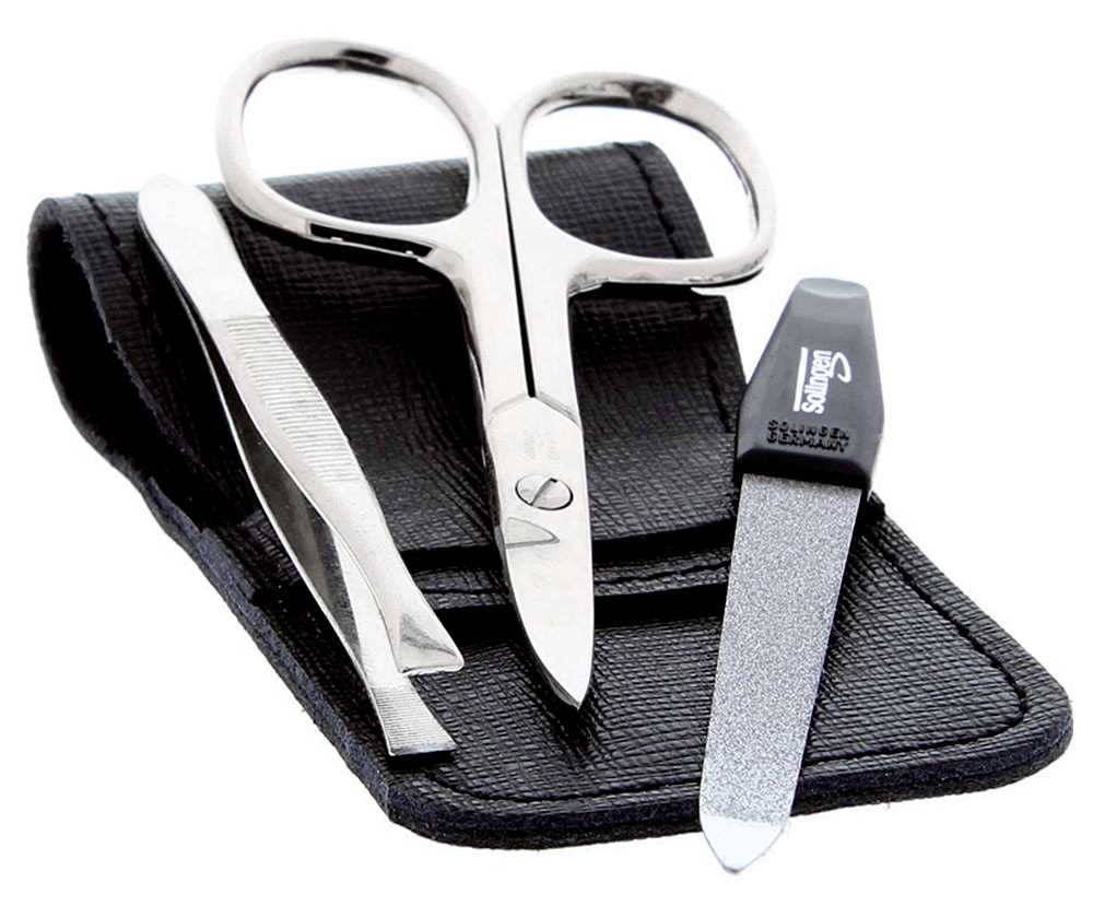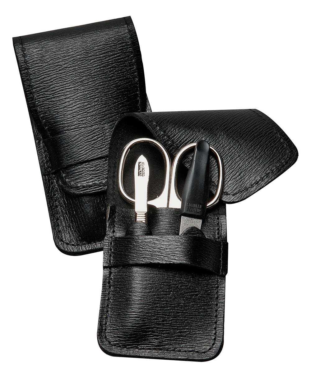 Weiterführende Links zu "Maniküre Set, 3 tlg. Nagel-Schere, Feile, Pinzette im Taschenetui innen Leder, schwarz mit Schlaufe."