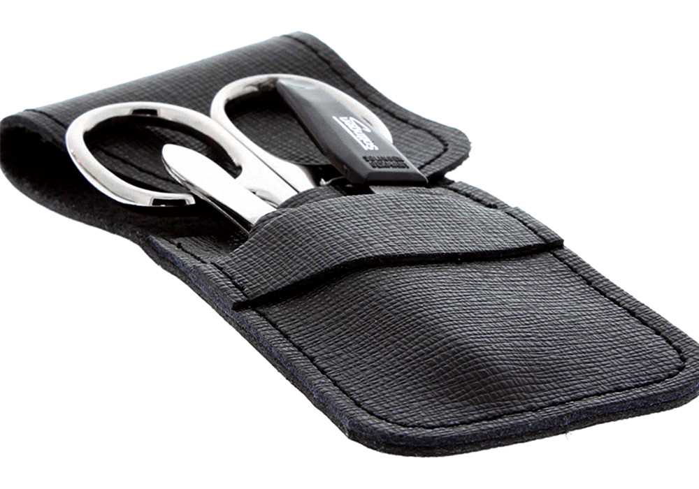 Maniküre Set, 3 tlg. Nagel-Schere, Feile, Pinzette im Taschenetui innen Leder, schwarz mit Schlaufe.