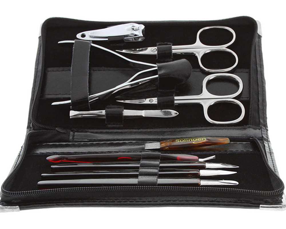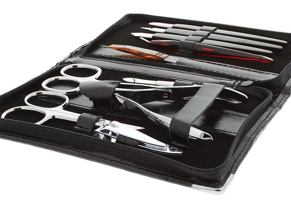 Instrumente: | Eckenfeilen, Hautscheren, Hautzangen, Instrumententasche, Maniküre, Nagelfeilen, Nagelhautschieber, Nagelknipser, Nagelreiniger, Nagelscheren, Pinzetten |