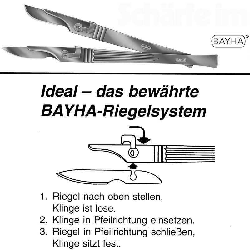 Das bewährte BAYHA-Riegelsystem ermöglicht fest sitzende Skalpellklingen. Jede Klinge passt in jeden Griff.